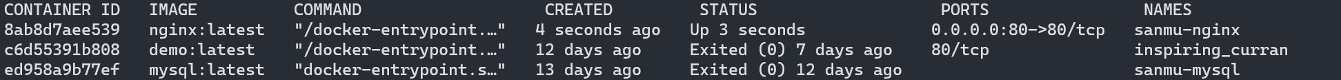 通过上面的命令,可以找到sanmu-nginx的container id,我们可以使用这个id来停止我们的容器