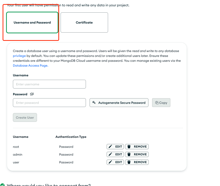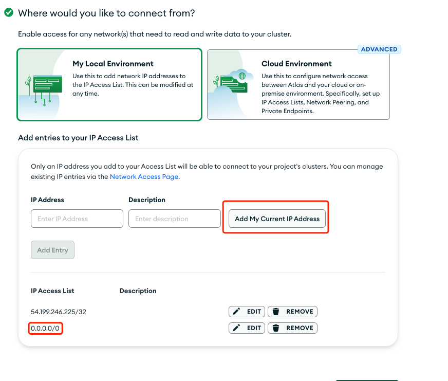 这里要设置白名单,只有白名单下面的 ip 才能访问这个数据库,算是安全的一种操作。点击 Add My Current Ip Address 添加当前的 ip,也可以设置 0.0.0.0/0 代码开放所有的 ip。