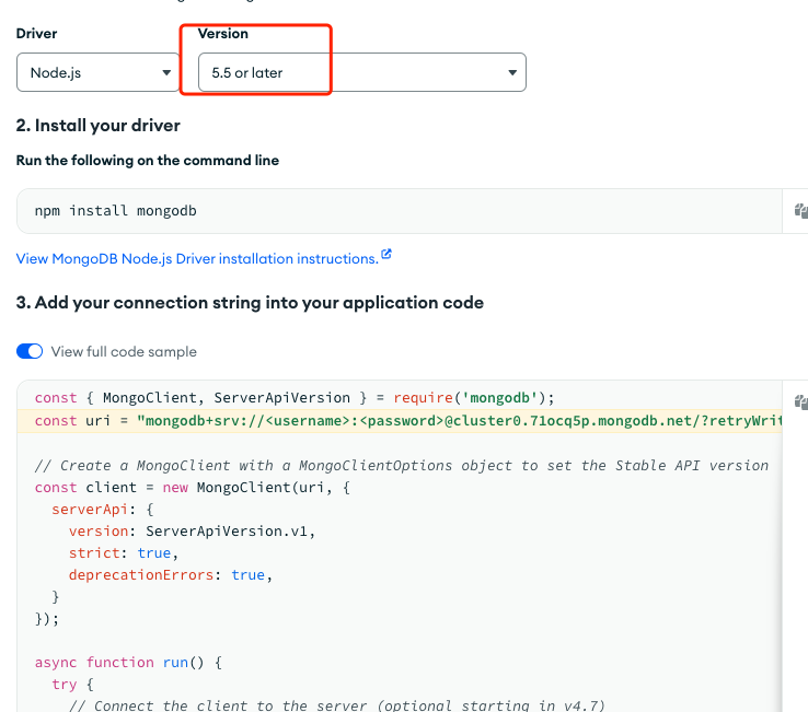 选择 Version 之后,下面会生成对应的连接代码
